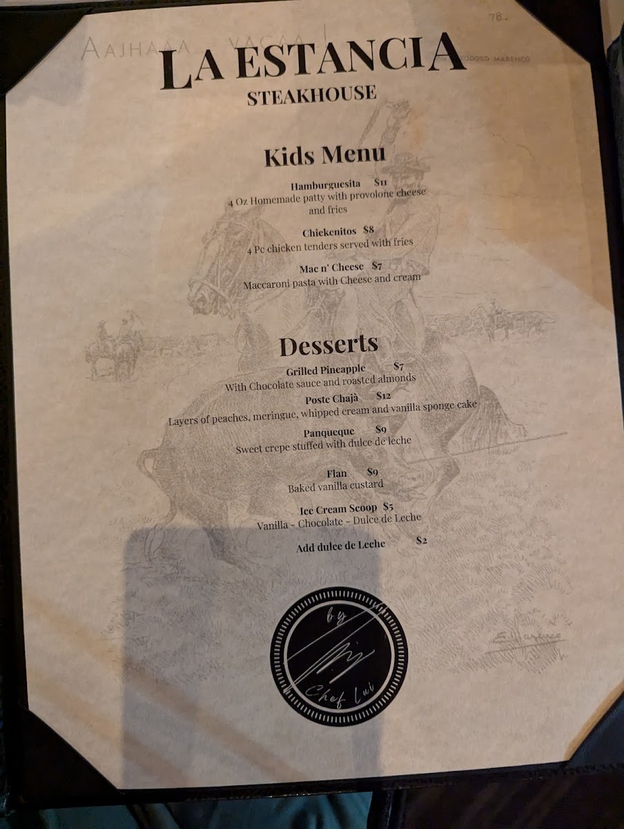 Introducing the menu at La Estancia Argentinean - Uruguayan Steakhouse is a flavorful journey through rich culinary traditions. Starting off, guests can indulge in the Picada para 2, featuring a delightful selection of cold cuts and cheeses or the refreshing Ceviche de Camaron for a zesty kick. The mains showcase the star of the show: exceptional cuts of beef, including the hearty Chivito al Plato sandwich and the classic Milanesa. Don’t miss the vegetarian options like the decadent Four Cheese Ravioli. Accompanying sides such as Steak Fries and Sautéed Garlic Mushrooms perfectly complement the meal. Customers rave about the authenticity of the dishes, with many feeling transported to Argentina and Uruguay through flavors. The warm atmosphere and attentive service elevate the dining experience, making it a perfect venue for any occasion.